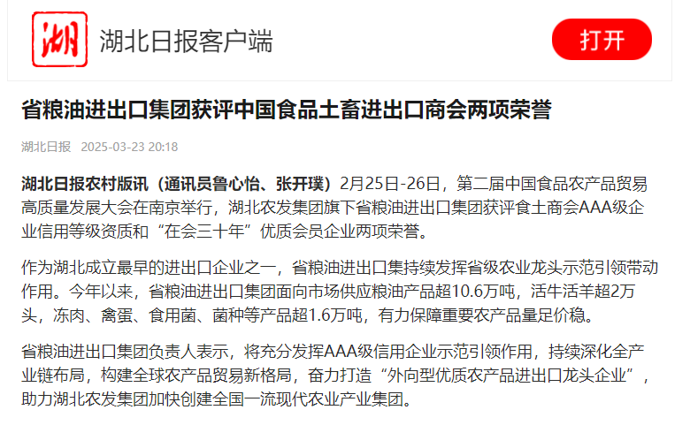 湖北日報:省糧油進出口集團獲評中國食品土畜進出口商會兩項榮譽